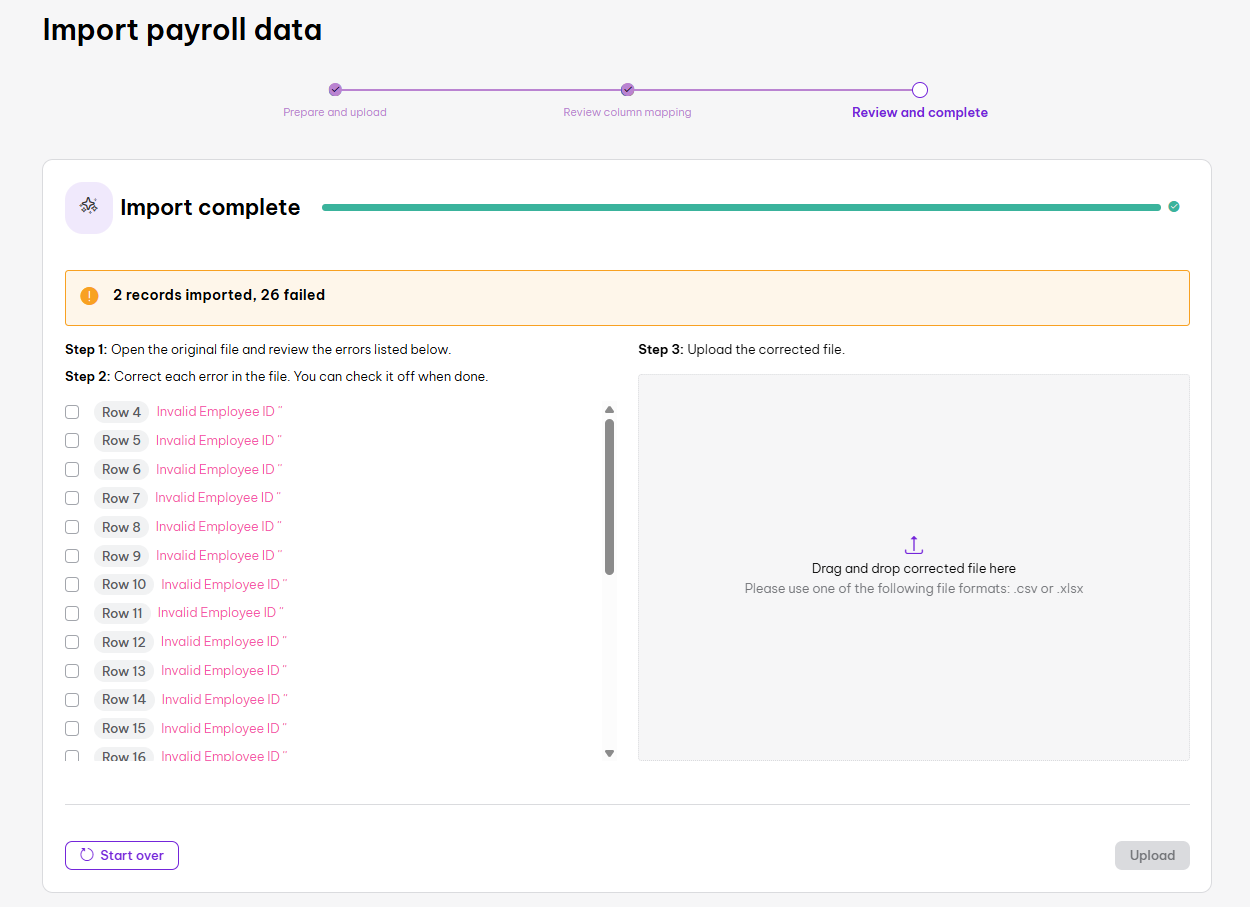 Error Report: If any rows fail (e.g., for a terminated employee or unrecognized category), you can view them on the "Review and complete" screen.
