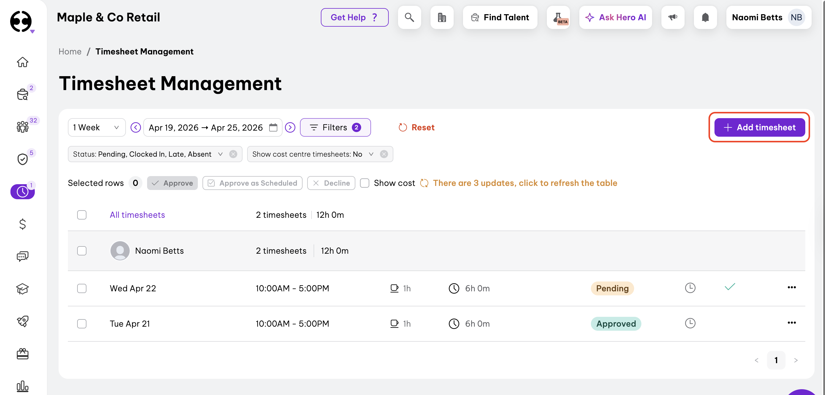 When you submit a timesheet for an employee, the platform will automatically approve the timesheet.